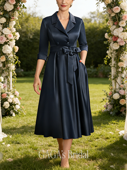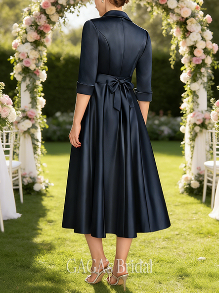 • Wedding Guest A-line Refined V-Neck Collared Tea-Length Satin Mother of the Bride Dress With Bow